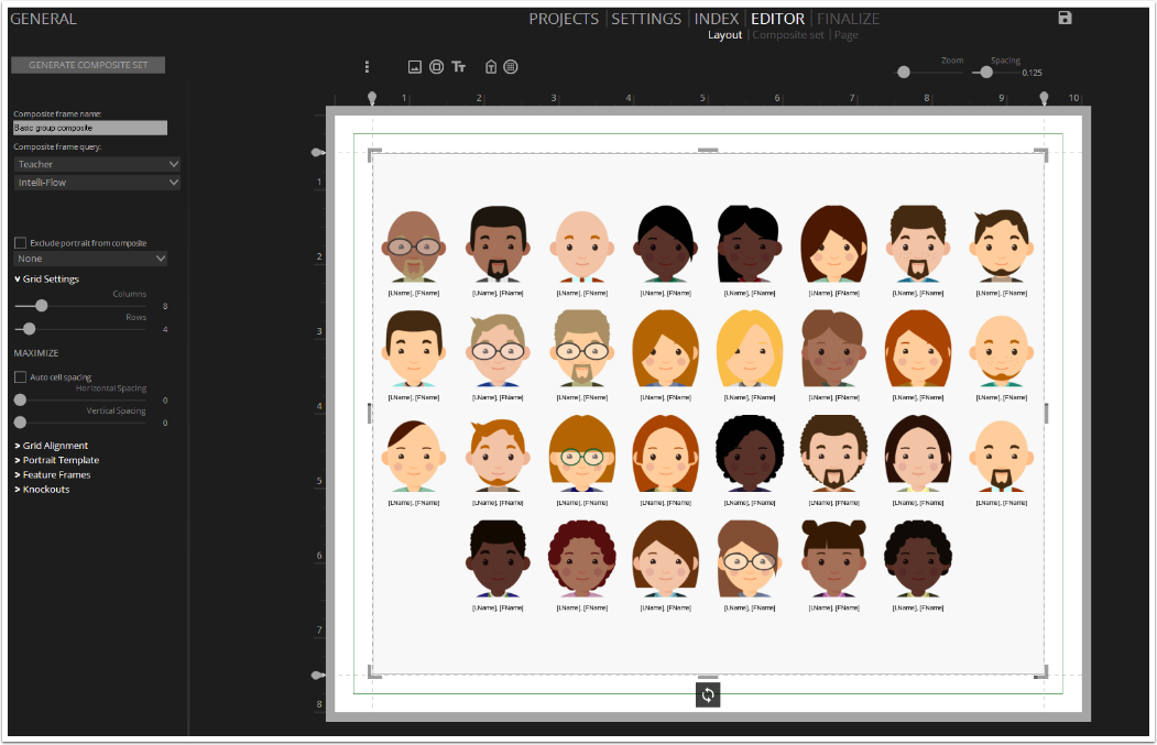 Easily and quickly create class photo composites complete with graphics and even names. Submit a design for a free price quote. Use the magical IntelliFlow and make-it-fit features to get your images on the page in a blink of an eye.